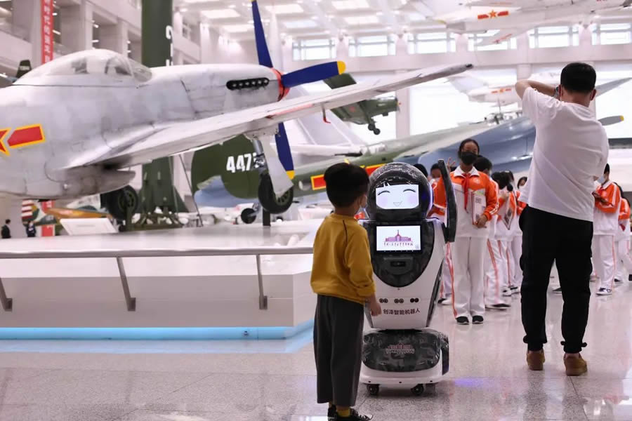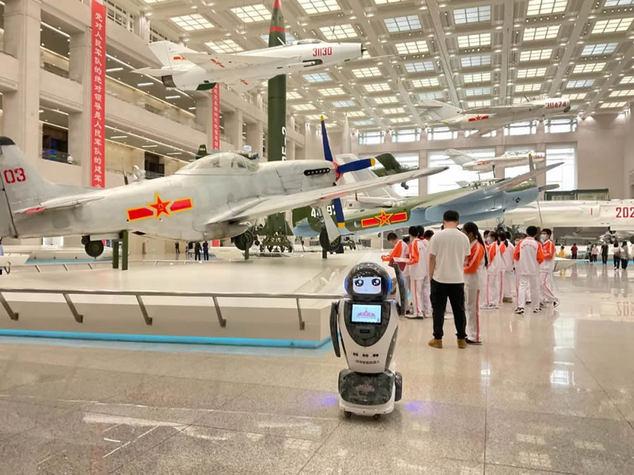 創澤博物館服務機器人“創創”亮相中國人民革命軍事博物館,每天為觀眾提供軍事科普講解、信息查詢等服務。除了常規的語音介紹,機器人還能隨機播放館藏戰機重要歷史時刻的音視頻畫面,呈現出集聲音畫面于一體全景式講解。