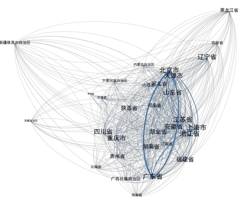 基于 2200 家我國人工智能骨干企業(yè)的技術合作關系,報告構建了價值網(wǎng) 絡空間分布圖(如圖 16 )。從技術合作關系的密度看,北京市、廣東省和上海 市構成了人工智能產(chǎn)業(yè)集群網(wǎng)絡結構的三個“J點”。同時,北京市、廣東省、 上海市、江蘇省、安微市、四川省、湖北省、湖南省、重慶市、山東省和福建 省之間存在密集的人工智能技術合作關系