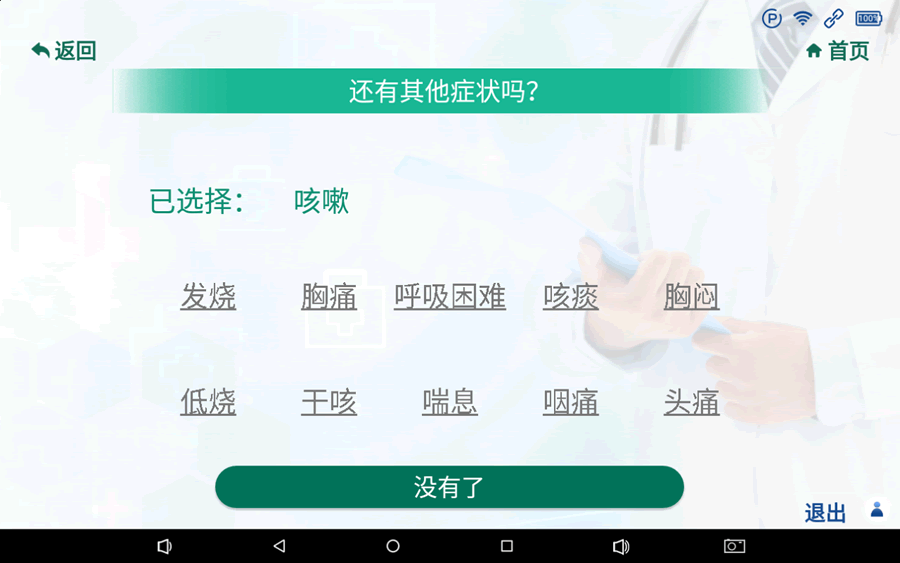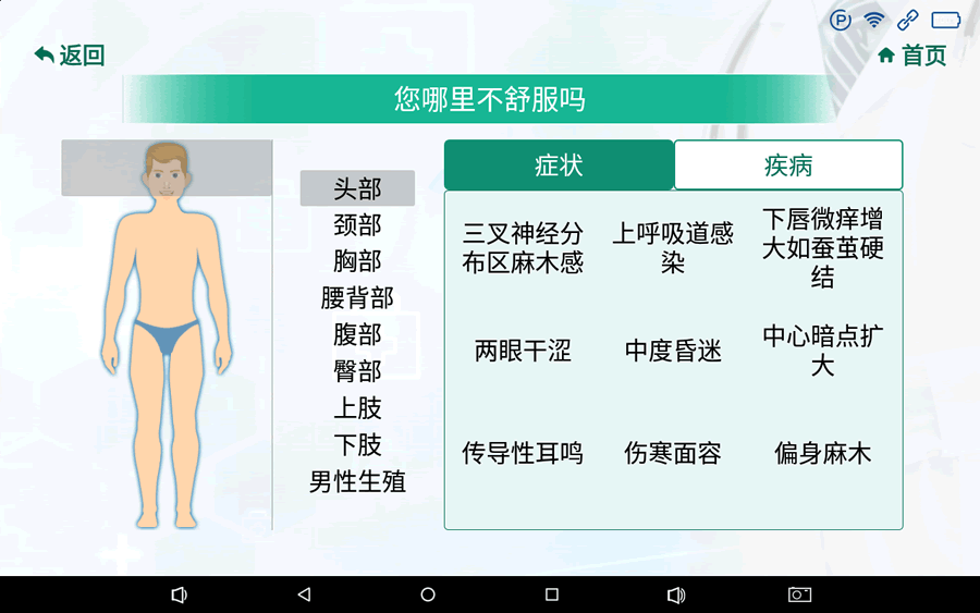 1.通過點擊首頁預檢分診按鈕或語音“預檢分診”進入性別和年齡選擇頁面,通過點擊屏幕或直接語音如(30歲男性)選擇患者的性別和年齡,然后跳轉到癥狀或疾病選擇頁面;
