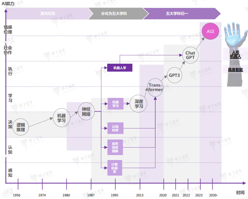 憑借機器視覺,自然語言理解等人工智能技術的發(fā)展,初代“AI+”機器人產品逐步成熟,生成式AI的爆發(fā)與通用人工智能的曙光
