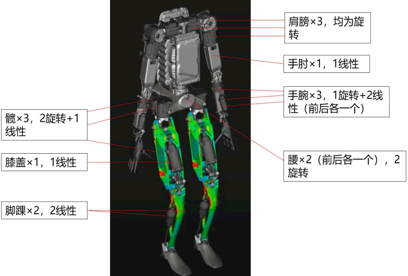 身體擁有 28個執(zhí)行器,14個旋轉(zhuǎn)執(zhí)行器+14 個線性執(zhí)行器。分布如下:1)左臂+右臂: 7+7,其中肩部 3(×2)個旋轉(zhuǎn)執(zhí)行器,肘部 1(×2)個直線執(zhí)行器,手腕 1(×2)個旋 轉(zhuǎn)執(zhí)行器+2(×2)個直線執(zhí)行器;2)左腿+右腿:6+6,其中髖部 2(×2)個旋轉(zhuǎn)執(zhí)行器 +1(×2)個線性執(zhí)行器,膝蓋 1(×2)個線性執(zhí)行器,腳踝 2(×2)個線性執(zhí)行器;3) 腰部:2 個旋轉(zhuǎn)執(zhí)行器。