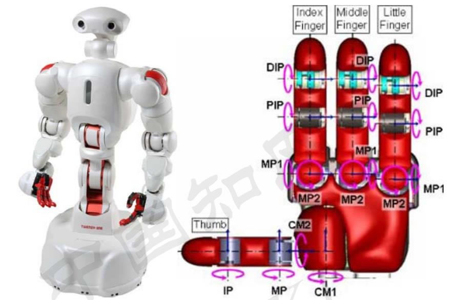 因此,我們定義靈巧手是指數(shù)≥3,自由度≥9 的末端執(zhí)行器。例如日本的 TWENDY-ONE 機器人,其靈巧手擁有 4 根手指和 13 個自由度。
