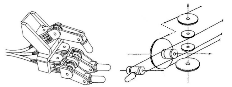 采用旋轉(zhuǎn)型驅(qū)動的靈巧手以 Stanford/JPL 手為代表,其驅(qū)動系統(tǒng)由直流電機和齒輪